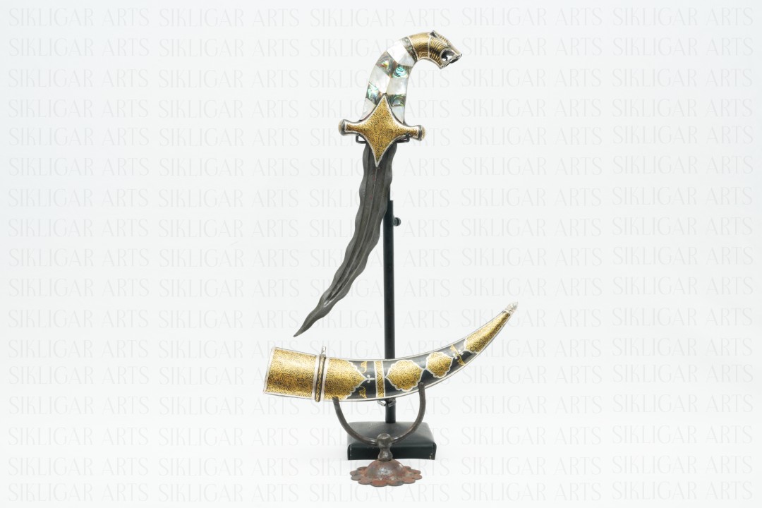 Indian oriental dagger knife in silver & gold koftgari in tiger face head handle with mother of pearl fittings and chevron pattern blade