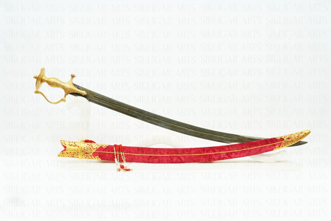 Indian handcrafted Silver Gilded Rajput Shamshir Sword with disc pommel or katori hand grip in gold damascening