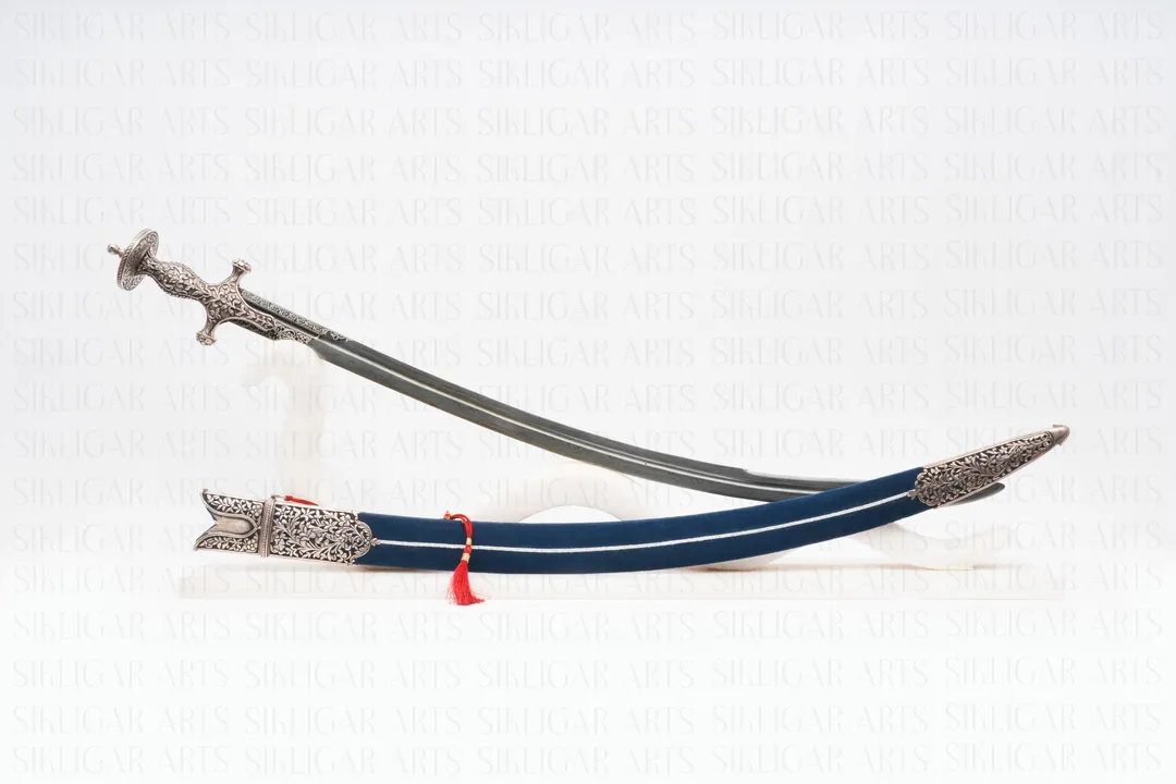 Indian handcrafted Gold Damascened Rajput Maratha Sword wuth Wootz Blade & Blue Velvet Scabard