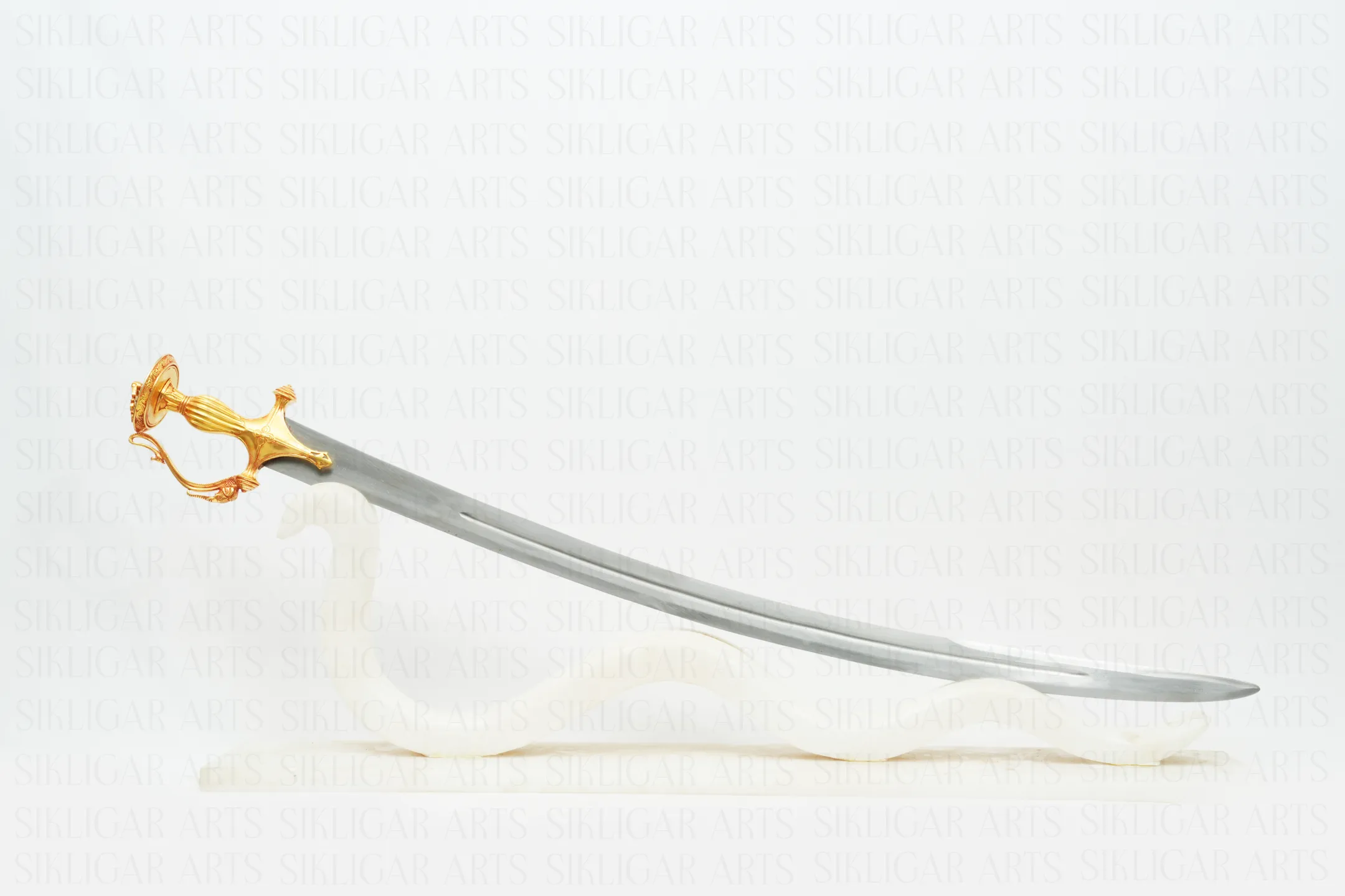 Indian handcrafted Sikh Rajput ceremonial gold gilded sword with disc pommelhand grip and knuckle guard.