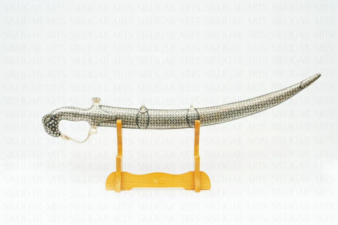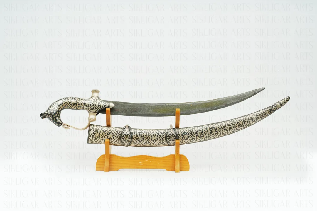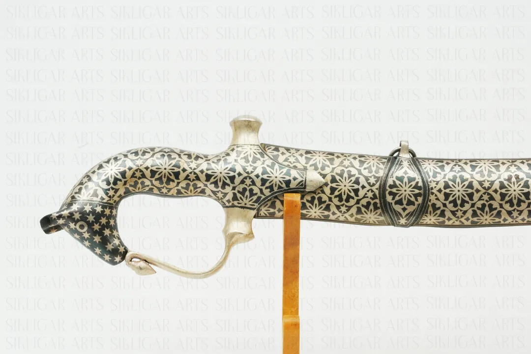 Indian handcrafted bachkani sword with horse head hand grip, silver damascening and damascus blade