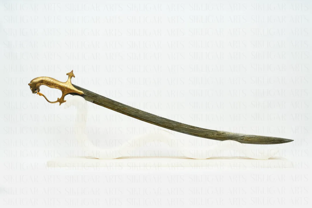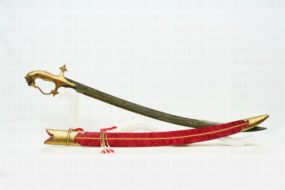 Indian Handcrafted Gold Damascened Talwar Sword with Lion Hilt & Damascus Blade