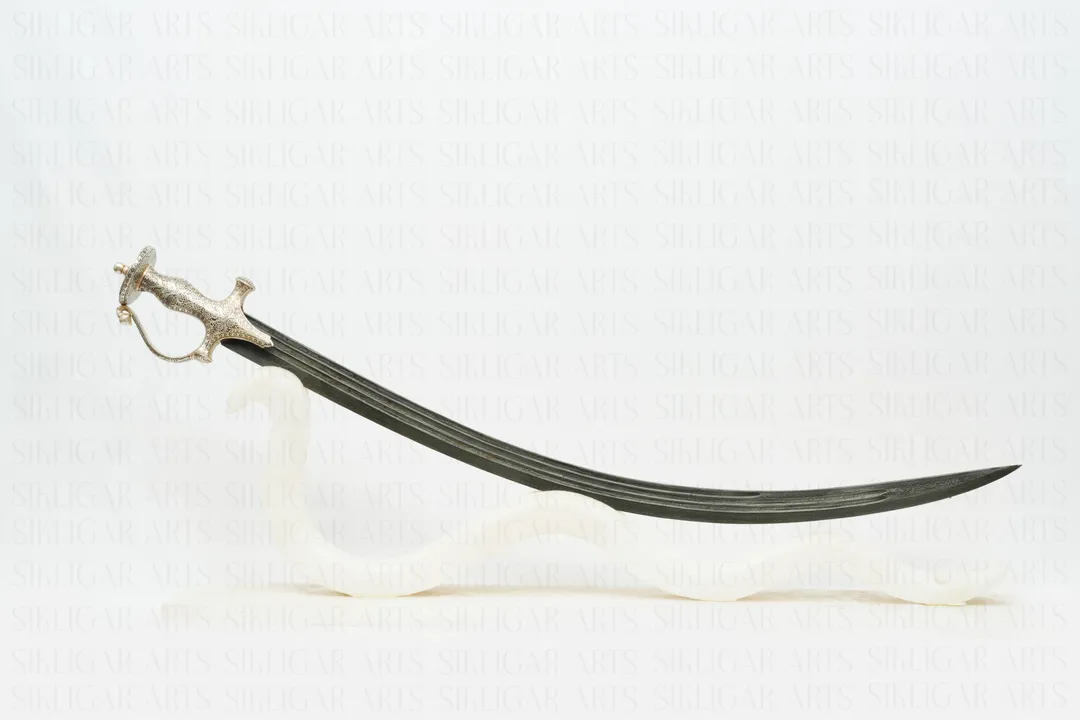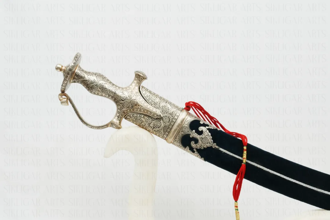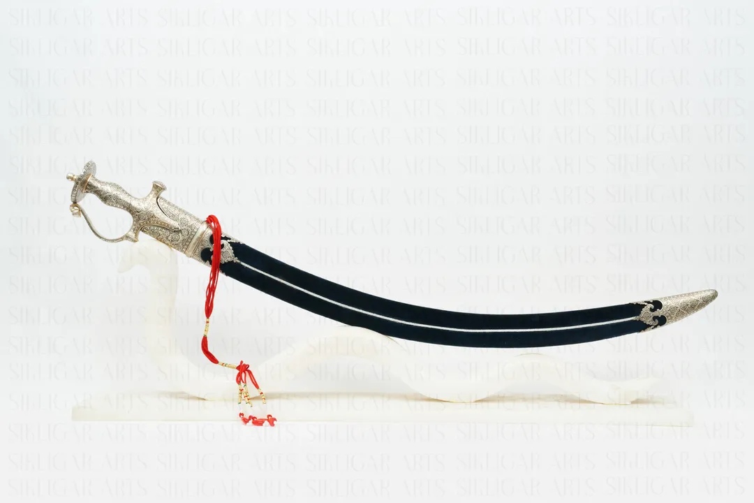 Indian handcrafted Silver Damascened Rajput Maratha Sword with Damascus Blade & Blue Velvet Scabard