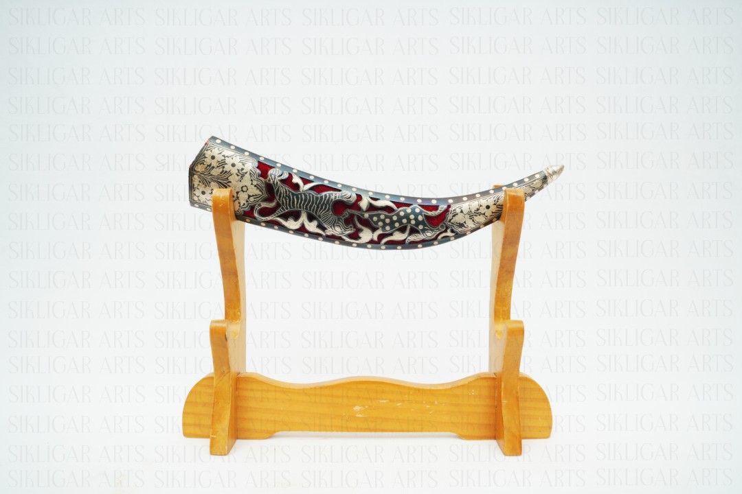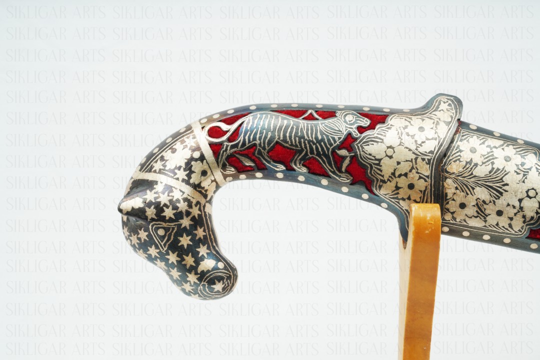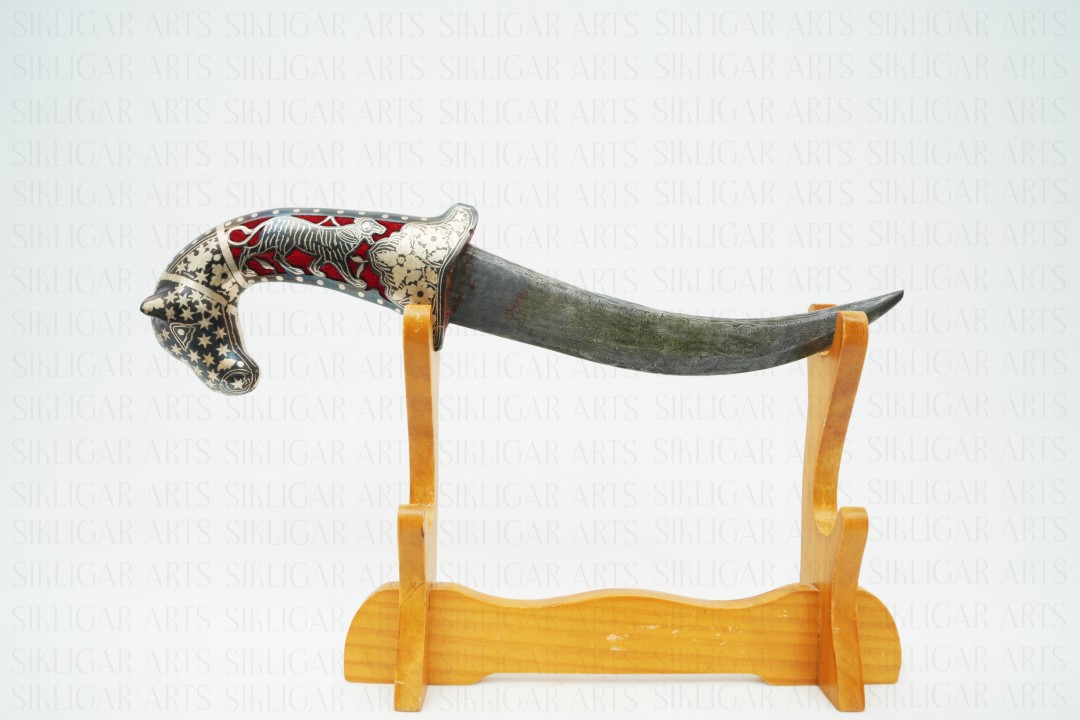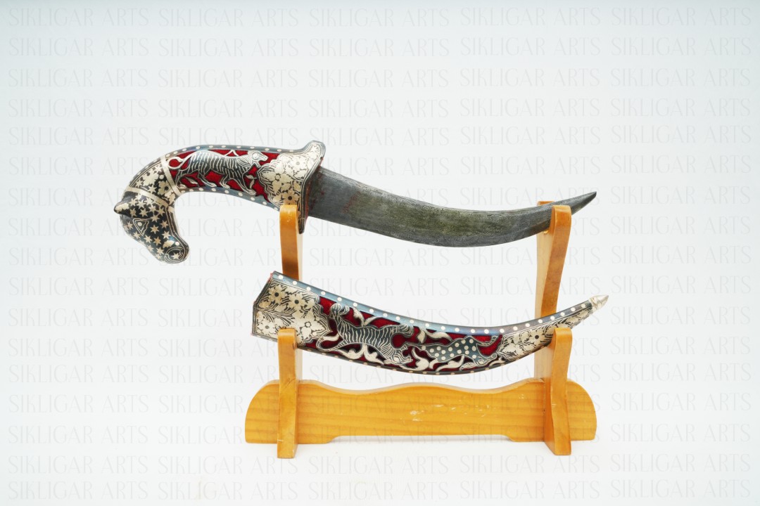 Vintage ottoman islamic hand chiseled court knife dagger khanjar with crown/mukut hand grip handle and silver damascening in foliage pattern with red inner lining in the scabbard highlighting the...Read More